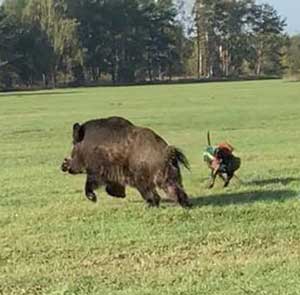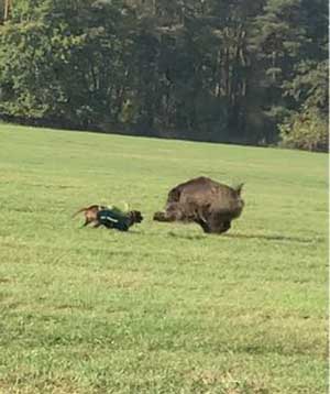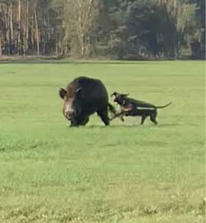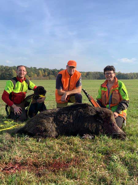 Ca. 100 m weiter wurde es sehr dicht und das Gespann tauchte in einen ca. 4 m hohen Schwarzdornbestand ein. Fast Zeitgleich gab der Rüde Laut, es brachen 2 Stück. Rehwild heraus und gingen hochflüchtig am Richter vorbei, auf die Wiese in die Richtung wo wir hergekommen waren. Die Führerin rief: „ Sau nach vorn“ , ich entgegnete ihr das Rehwild ansichtig wurde. Sie war sich sicher, dass Sie ein laufkrankes Stück Schwarzwild vor dem Rüden gesehen hatte. Daraufhin gab ich Ihr die Anweisung den Rüden von der Halsung zu nehmen und zur Hetze zu schicken. Manuela brauchte etwas, um sich durch den dichten Schwarzdorn zum Hund zu arbeiten, bekam diesen aber doch recht zügig von der Halsung. Sofort folgte der Rüde fährtenlaut in gerader Richtung nach vorn. Erleichtert von der Erkenntnis das Manuela recht hatte und der Hund nicht dem Rehwild nachsetzte, sahen wir kurze Zeit später ein großes Stück Schwarzwild gefolgt von einem Laut gebenden Hund auf der freien Wiese draußen. Ohne zu zögern nahm Manuela den recht tiefen Wassergraben an und war zügig auf der Wiese. Der Rüde hatte den Keiler nun erreicht und zwang durch Überholen desselben, dass Dieser aus der Flucht gebracht wurde. Mehrfach drehte sich Die Sau und versuchte den BGS zu schlagen. Dieser wich aber geschickt aus und folgte dem nun wieder ausbrechenden Keiler. Durch Kurzes Zufassen in die Hinterläufe, abermaliges seitwärts überholen und kreuzen des Laufweges unterband der Rüde ein weiterflüchten des für uns nun sichtbar laufkranken Keilers. Geschickt umkreiste Paule mit sehr gutem Standlaut in ca. 5m Abstand den Keiler und stellte ihn scharf. Eine günstige Gelegenheit abwartend und mit viel Übersicht brachte Manuela den Fangschuss in dem Moment an, als Paule am wenigsten in Gefahr war.