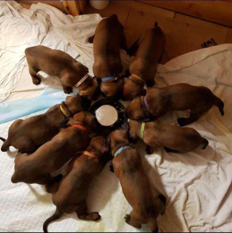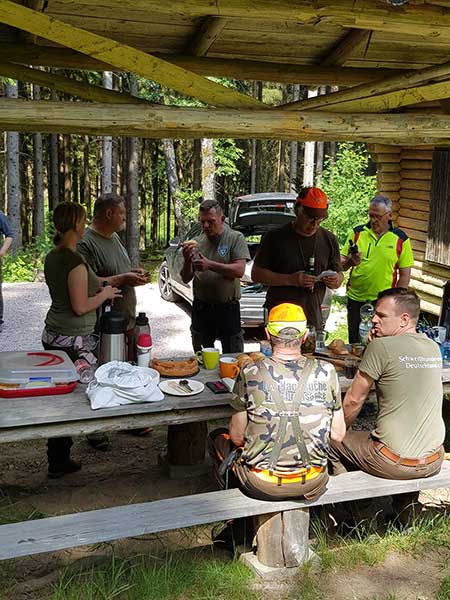 Während es sich die Meute an der Waldhütte gemütlich macht, bewerten die Richter in letzter Instanz die Form der einzelnen Hunde, um potenzielle Zuchthündinnen und –rüden nach klar definierten Kriterien zu identifizieren. Rene Schiffner, der Besitzer des Rüdenvaters Kanto stößt auch dazu um sich die Nachkommen nach langer Zeit der Entwicklung genau anzusehen. Es ist mittlerweile später Nachmittag, da zücken Hundeführer Hubert und Richter Marcel die Hörner und blasen zum Sammeln. Die Gespanne stellen sich in Reih und Glied auf der Waldwiese auf, um ihre Prüfungsergebnisse entgegen zu nehmen. Es folgt das Signal „Sau tot“ begleitet vom Jaulen der anwesenden Hunde. Alle Fährten waren mit Schwarzwildschalen getreten. Ein hoher Dank an die Richter und den Prüfungsleiter wird ausgesprochen, die durch ihre Kompetenz und Struktur einen reibungslosen Prüfungstag ermöglichten. Nun ist es geschafft. Der Prüfungstag ist vorbei und nach einigen guten Gesprächen löst sich die Versammlung mit dem Ansinnen eines Wiedersehens auf und verschwindet in die unterschiedlichen Himmelsrichtungen, aus denen sie gekommen waren. Zu guter Letzt bleibt nur ein großer Dank an die Richter, Helfer und Beteiligten im Hintergrund, die das ermöglichten und sich so sehr für das Hundewesen einsetzen.