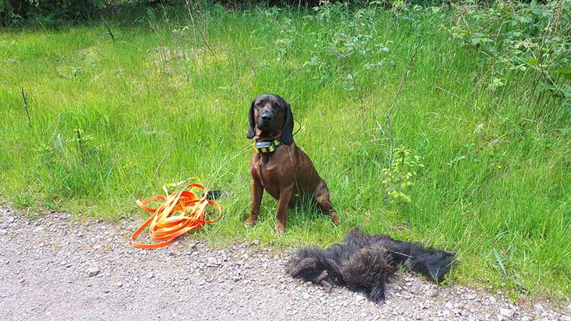 Dann geht es direkt los. Als erstes tritt Hubert mit seiner Hündin Emma an. Sie beginnen die Suche unter Aufsicht der Richter Ulli Tischer und Tino Fiedler sowie den Richteranwärtern Dr. Gerhard Struck und Marcel Handrich. Nachdem die Suche vorangeschritten ist, verlassen die Losnummer 3 bis 5 den Morgensammelplatz und begeben sich unter ortskundiger Führung durch Züchter Peter an die Waldhütte im Revierzentrum, um dort auf ihren Einsatz zu warten. Nur Losnummer 2, Franz mit Vitus, bleiben alleine zurück, um sich auf die Suche vorzubereiten und nervlich zu sammeln. Nach fleißiger Suche kommt schließlich Emma mit Führer Hubert gekonnt bis zum Stück. Die erste Hürde ist also geschafft, erstmal durchatmen.