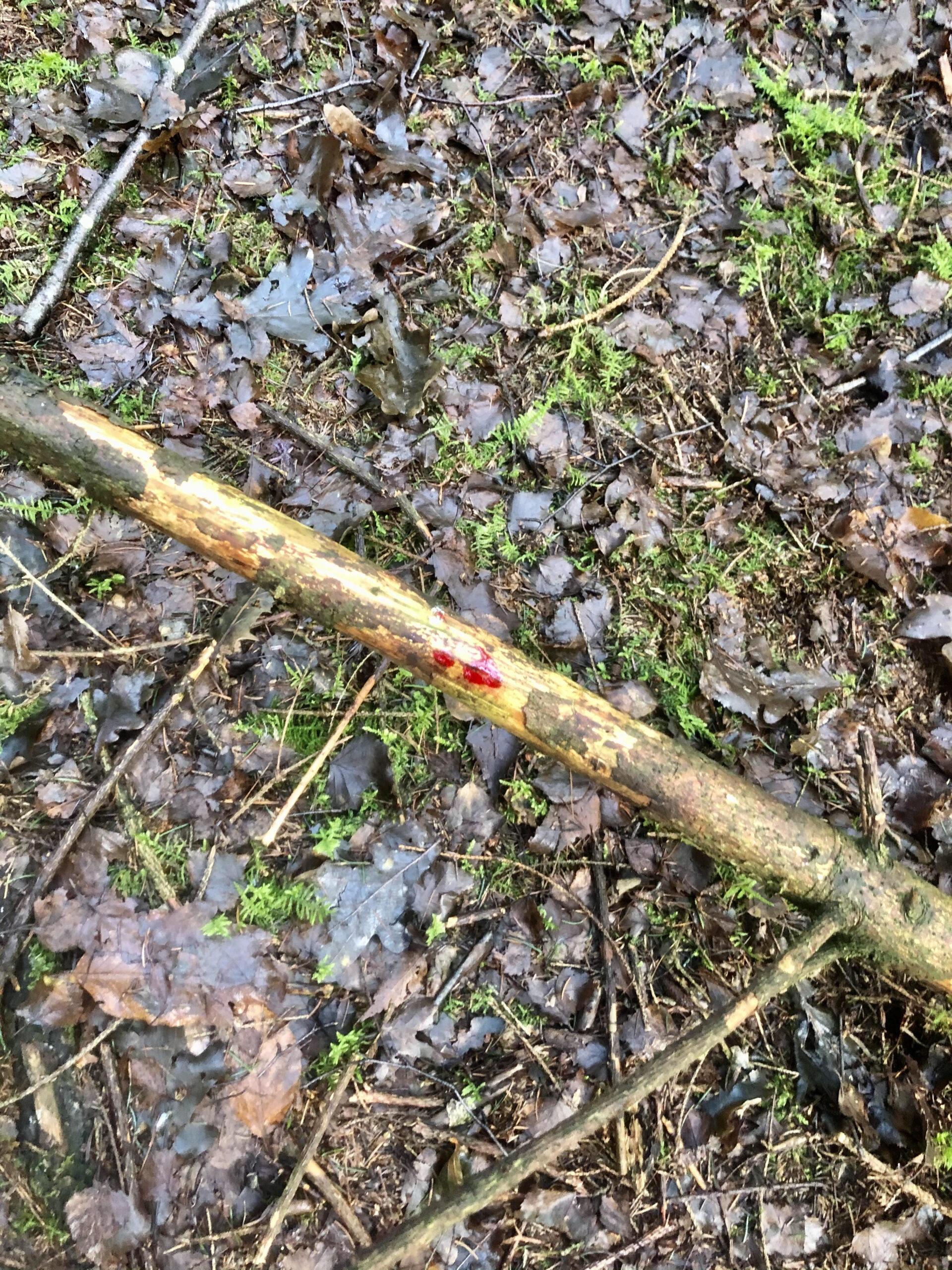 Plötzlich verwies der Hund auf einem umgefallenen Baum einen kleinen Tropfen Schweiss, damit bestätigte sich die Zugehörigkeit der kranken Sau zur Rotte. Es ging in eine Aufforstung, in der der Hund nach links abbog und den Wechsel verließ. Nach ca. 200 m konnte man dem Hund anmerken, dass er die Fährte verloren hatte. Durch Kreisen versuche er die gerechte Fährte wieder aufzunehmen, leider gelang Ihm dies nicht. Wir beschlossen eine Pause zumachen, ich ließ den Hund schöpfen. Währenddessen veranlasste ich den Schützen das Auto nachzuholen, da wir bereits 7,8 Kilometer auf dem Zähler hatten.