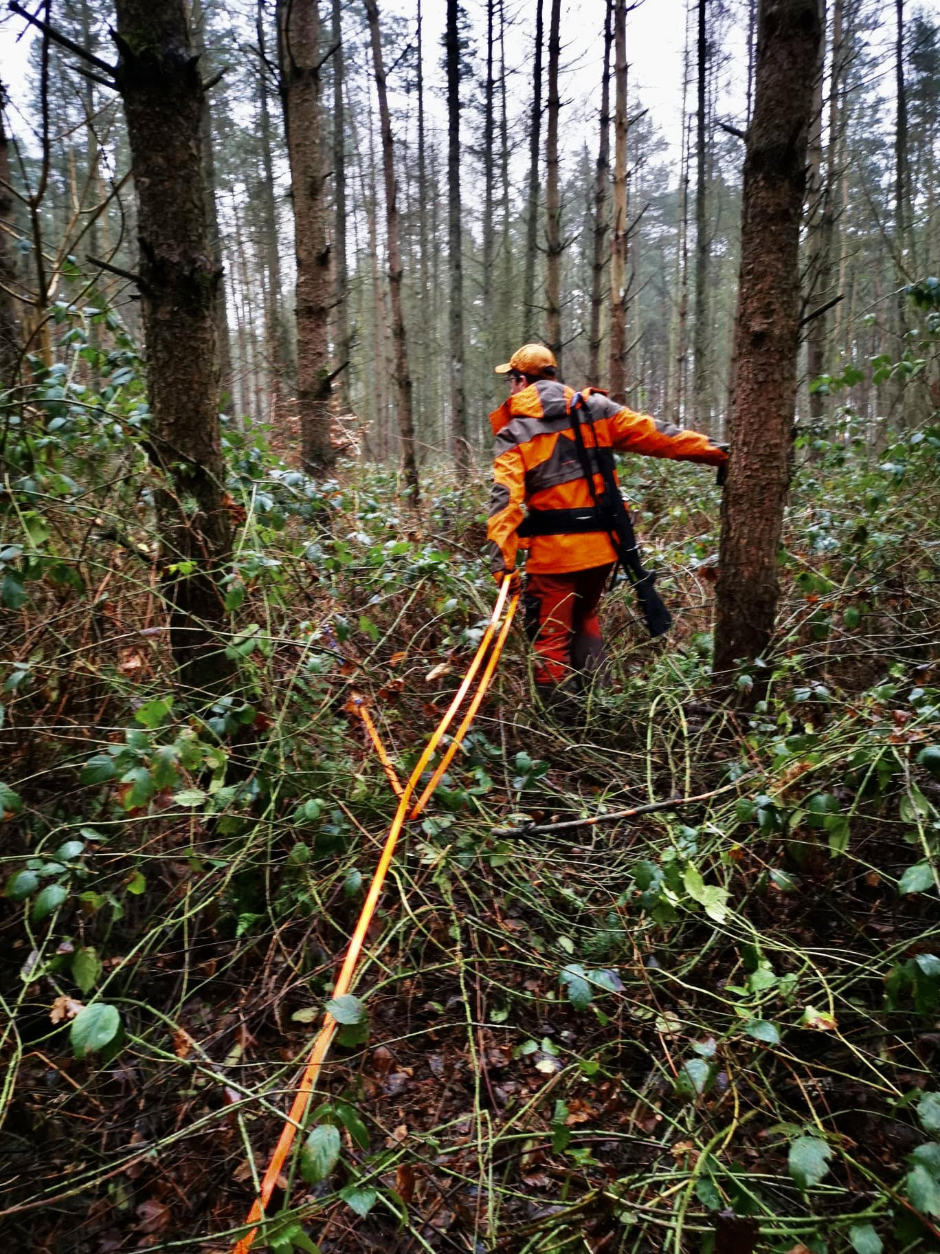 An dem Punkt, wo wir zuvor den Wechsel verlassen hatten, zog der Rüde nun auf dem geraden Wechsel weiter. Am Fährtenbild war zu erkennen, dass wir nur noch einer Sau folgten. Also hatte sich das kranke Stück von der Rotte getrennt. Das Stück muss die ganze Nacht gezogen sein. Es nahm kein Wundbett an, etliche Wiedergänge und Kreise zogen sich über die nächsten Abteilungen im Forst. Wir standen wieder vor einer Suhle, die das Stück noch in der Nacht angenommen hatte. Dies wies darauf hin, dass die Sau Kühlung suchte. Nach 10,4 Kilometern kamen wir an die nächste Reviergrenze zu den Landesforsten. Nach einem Telefonat mit dem zuständigen Förster, war die Fortführung der Nachsuche kein Problem. Ein zusätzliches Glück war die Unterstützung des Försters und seiner Frau bei der Suche. Nach einer kurzen Pause und Einweisung durch den Förster in sein Revierteil wurde die Nachsuche wieder aufgenommen. Jetzt ging es in eine Fläche von über 30 ha Dornenverhau. Die Sau zog immer noch auf klaren Wechseln des Schwarzwildes, einen 90° Abgang der Sau überschoss mein Rüde, bögelte sich aber nach einer kurzen Zeit wieder auf die gerechte Fährte. Unser Besuch im Dornenverhau blieb nicht unbemerkt, zwei Stück Rehwild und ein Rudel Rothirsche machten vor uns hoch. Wir näherten uns zügig auf einer Rückegasse dem Ausgang des Urwaldes und vor der nächsten Spurbahn stellte ich fest, dass es bereits 15.30 Uhr war. Ich beschloss, die Suche für heute zu beenden. Alle waren sehr erschöpft. Am Ende des Tages zeigte das Garmin 12 Kilometer an.