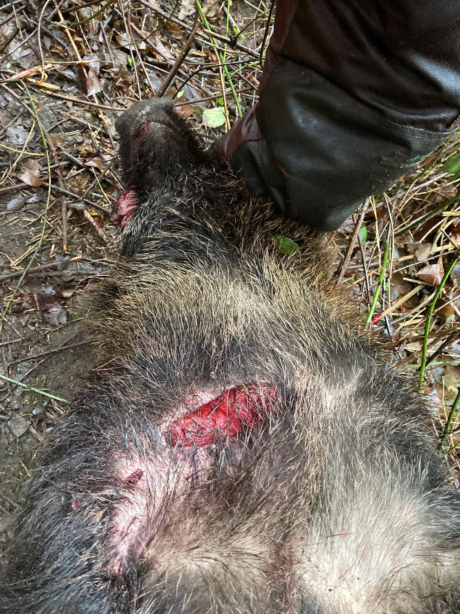 Jeder Hundeführer kennt diese Zweifel an einem gewissen Punkt der Nachsuche. Aber nein, man darf nicht am Hund zweifeln! Also wieder da angesetzt, wo die Sau über die Rückegasse gebrochen ist. Wir folgten weiter der Fährte, die kurz vor der Kreisstraße wieder in die Dornen führte. Jetzt verwies der Hund wieder abgestriffenen Schweiss und nach mehreren 100 Metern vernahmen wir erneut schweres Röcheln. Sofort wurde der Hund geschnallt, alles ging blitzschnell, die Sau brach aus den Dornen, ein Schuss konnte angetragen werden und die Sau machte noch 200 m bevor sie verendete. Es stellte sich heraus, dass der Schütze auf dem Feld das Stück mit seiner Kugel am Blatt und Stich touchiert hatte, worauf die Knochensplitter am Anschuss schon hingewiesen hatten.